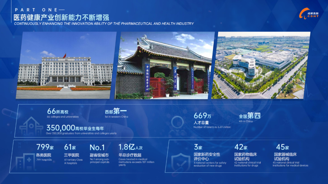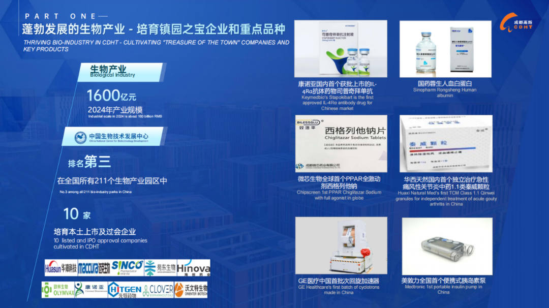成都高新区作为全省、全市生物医药产业发展的主阵地,聚集了3000余家国内外优质生物医药企业,2024年生物医药产业规模突破1600亿元,连续6年保持两位数增长,而成都天府国际生物城在全国所有211个生物产业园区中排名第三。聚焦现代生物技术药、化学创新药、高性能医疗器械、专业外包服务和健康服务领域,形成了一整套紧密关联、高度耦合的创新药械研发技术链和成果转化产业链,产业配套完善,产业人才荟萃,医疗资源丰富,具有蓬勃发展的产业生态,将为全球生物产业创造价值。